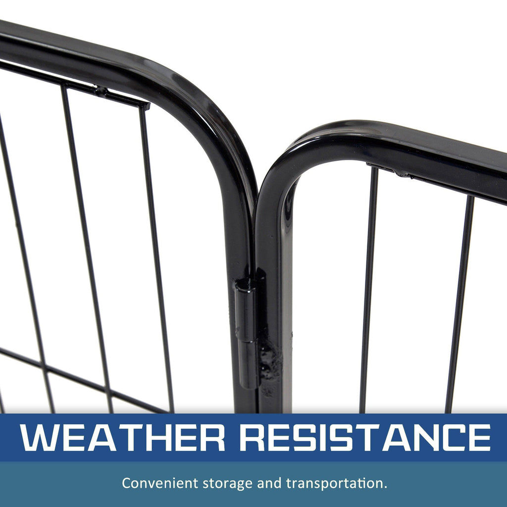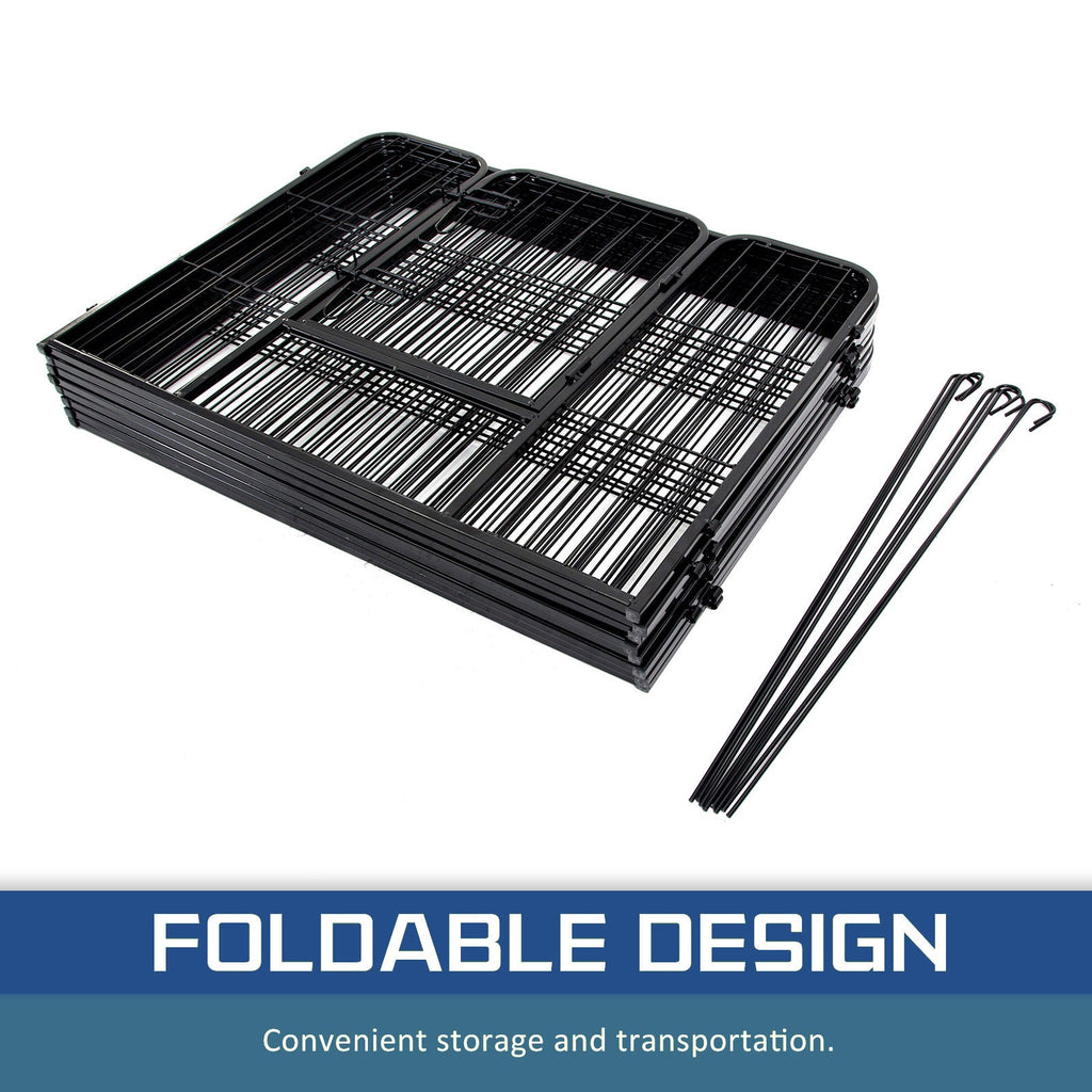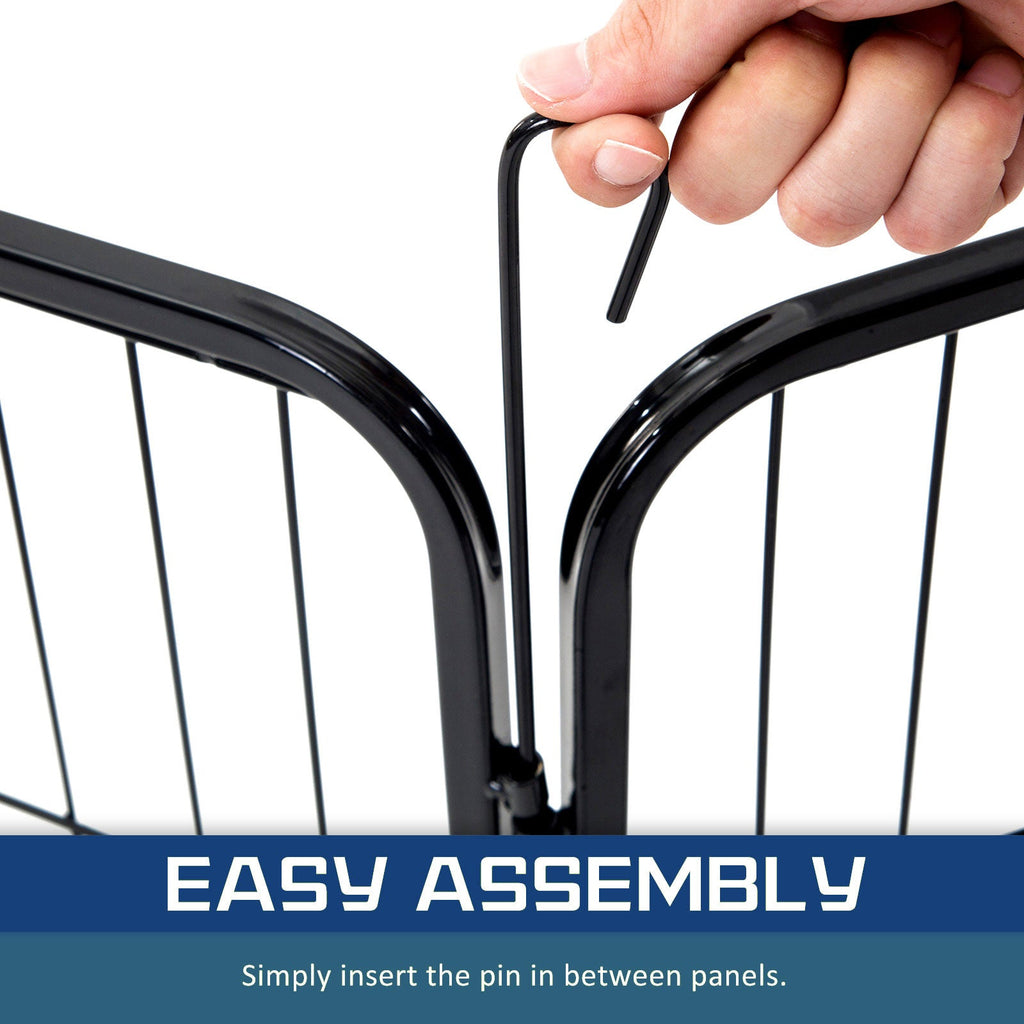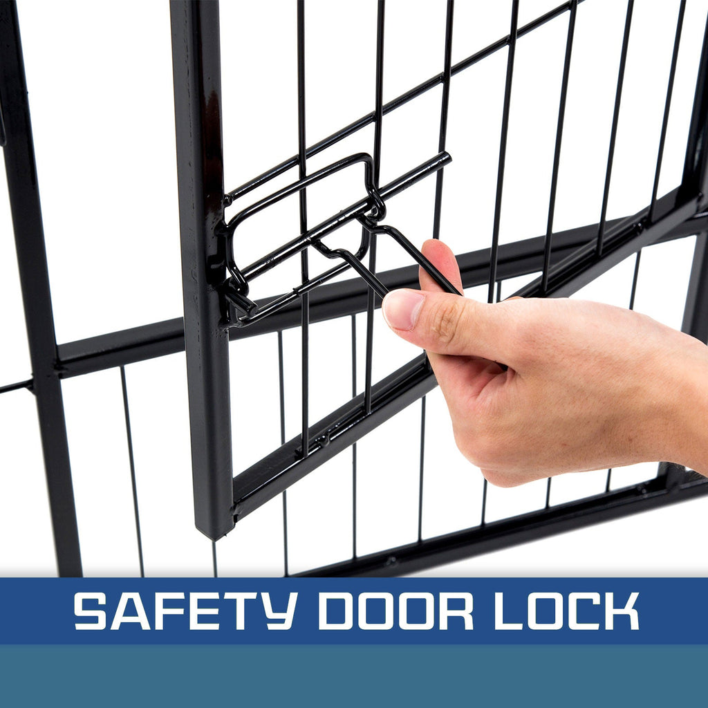 It is a multi-configuration playpen with 8 panels which allows you to turn your playpen into different shapes. The playpen is made of durable extra heavy duty steel frames construction with black powder coat finish. This fine finish provides long lasting protection and weather resistance. The access door has bolt latches and this ensures that your pet doesn?€?t have the opportunity to run away and the round edges ensure pet safety.