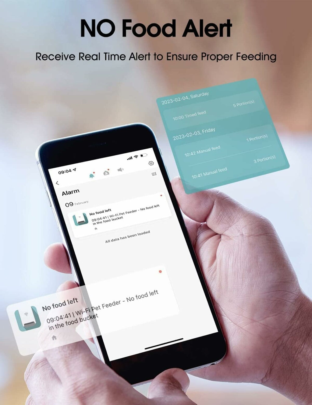Alarm function: Will notify you when the feeder is holding less food, no food, or food stuck.