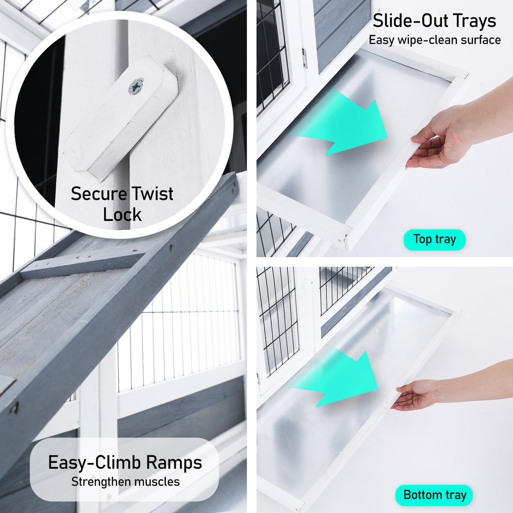 Made from non-toxic fir wood and galvanized mesh wire, our hutch provides a safe and durable space for your pets to rest and exercise. With a double-level enclosure and a ramp to strengthen your pets' muscles, this hutch is designed to meet your pets' needs.