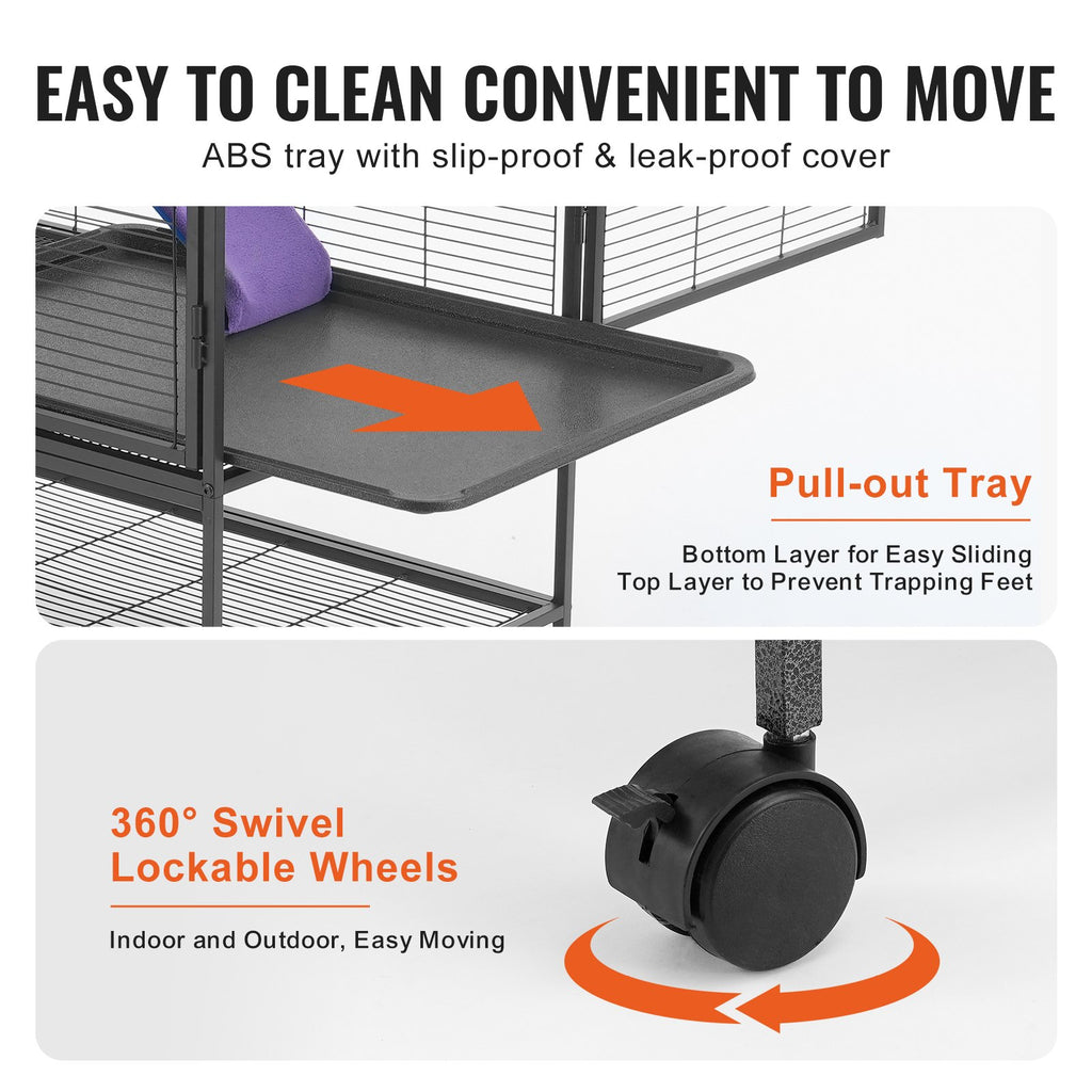 Our metal rolling pet cage comes with lockable rolling wheels, allowing easily move your pets from indoors to outdoors, letting them enjoy sunlight and nature. Additionally, there's a large storage shelf above the wheels for keeping pet supplies organized and saving space.