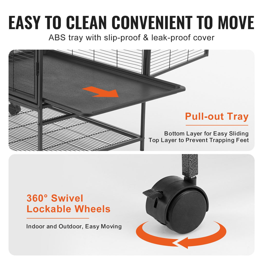 Our metal rolling pet cage comes with lockable rolling wheels, allowing easily move your pets from indoors to outdoors, letting them enjoy sunlight and nature. Additionally, there's a large storage shelf above the wheels for keeping pet supplies organized and saving space.